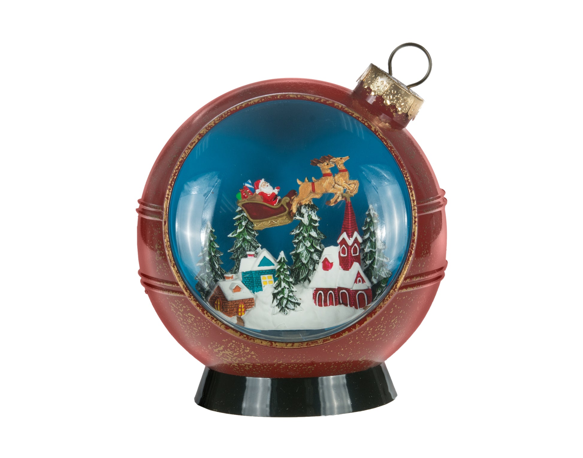 LED light up 8" Water Globe Ornament with Santa & Flying Reindeer.